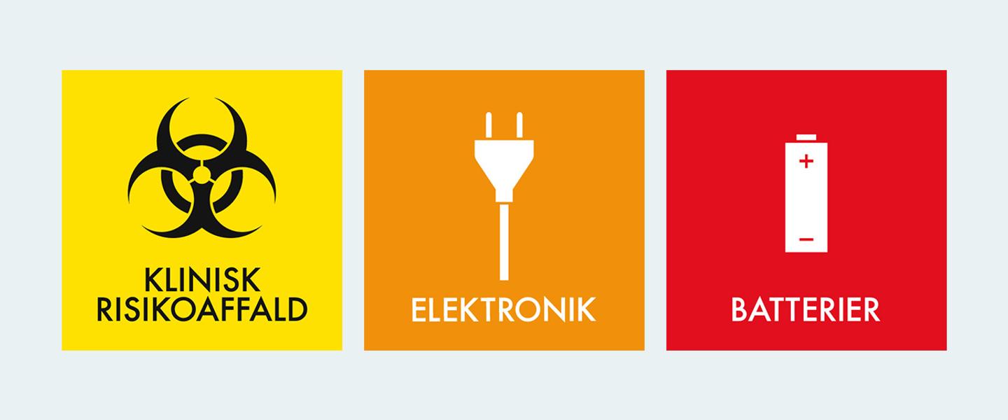 Elektronik affald - Elektronisk udstyr, der ikke længere fungerer eller er forældet, skal sorteres som elektronikaffald. Det kan være blodtryksmålere, termometre, printere, lamper, PC’er eller diagnostisk udstyr. Elektronikaffald indeholder ofte tungmetaller og andre stoffer, der gør det uegnet til forbrænding eller deponering som almindeligt restaffald. Det skal derfor afleveres særskilt og håndteres efter gældende regler.